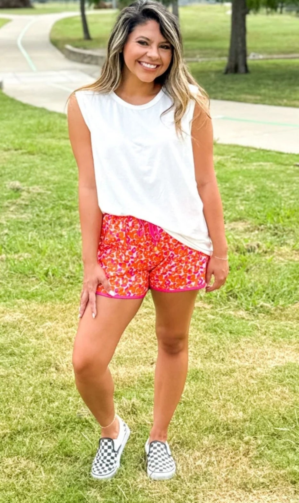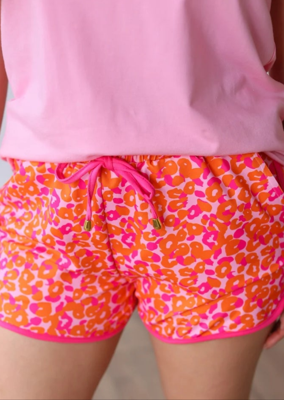 Unleash your wild side with our Spotted Adventure Shorts! Featuring a bold leopard print in pink and orange, these shorts are perfect for the risk-taker in you. Stay comfortable with the elastic waist and drawstring while you embark on your next adventure in style.